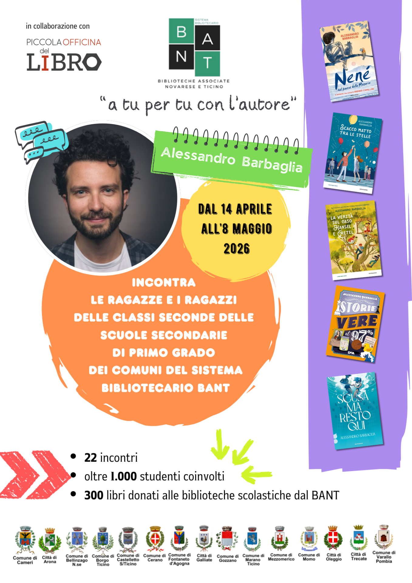 La settima edizione avrà come protagonista lo scrittore novarese Alessandro Barbaglia, noto per i suoi romanzi e per le opere dedicate a bambini e ragazzi. Dal 14 aprile all’8 maggio, l’autore incontrerà oltre 1.200 studenti in 15 Comuni, coinvolgendo un totale di 48 classi.
